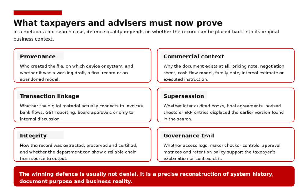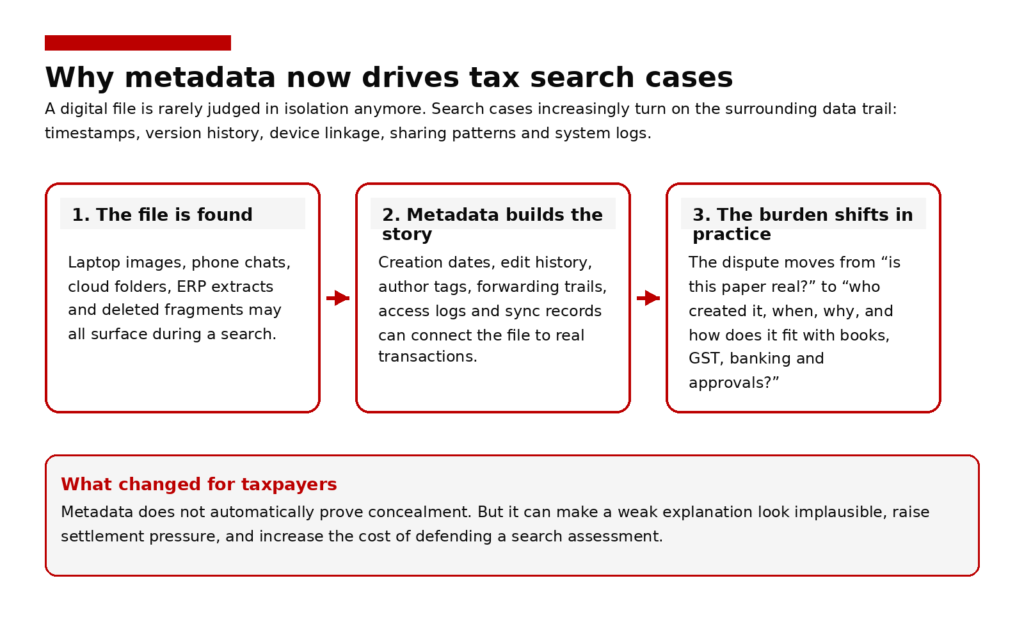 This is where metadata becomes more dangerous than the headline document. A loose Excel file can sometimes be explained away as modelling. A file whose properties show repeated revisions after vendor meetings, sharing across finance staff, alignment with invoice series, and correlation with bank credits becomes harder to dismiss as casual chatter. Deleted files can also be double-edged. The act of deletion does not prove suppression, but in a search case it can support an adverse reading when paired with restored fragments, cloud sync records or inconsistencies in employee explanations. For promoters and CFOs, the second-order effect is obvious: weak digital governance now creates tax incidence risk even when the substantive transaction has a defensible commercial story.