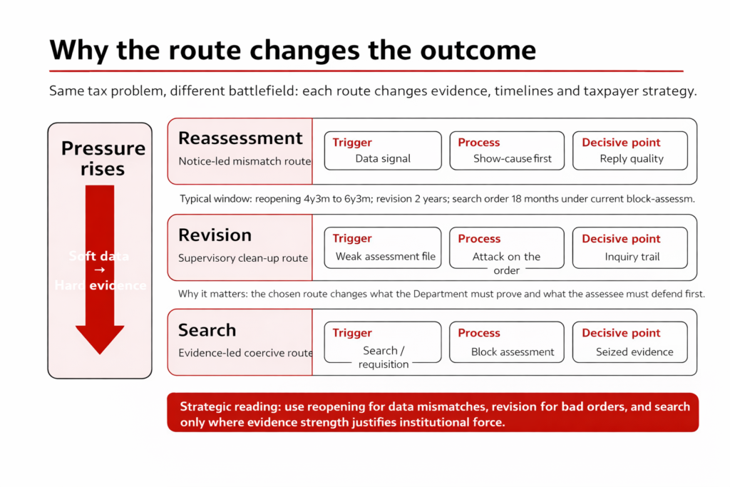 Section 148 is still the phrase most advisers reach for, because in live practice the old labels remain alive even after 1 April 2026. Section 536 of the Income-tax Act, 2025 saves pending proceedings, and even proceedings initiated on or after 1 April 2026 for years beginning before that date, under the repealed 1961 Act. That matters because the Department is not merely collecting more information; it is choosing among three routes. One begins with information suggesting escaped income. Another begins with a superior officer’s view that an assessment is erroneous and prejudicial to the revenue. The third begins with a search warrant. Those choices shape burden, evidence, pressure, and the room available for repair. (Income-tax Act, 2025, section 536; CBDT transition FAQs, March 2026.)