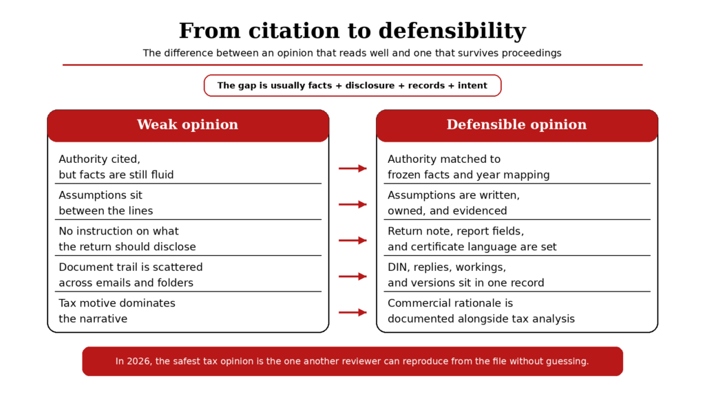 In 2026, a tax opinion survives less on elegant citation than on fact discipline, disclosure quality, and a documentary trail that can withstand a digital proceeding.